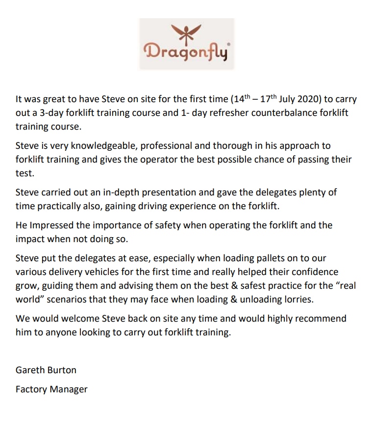 Its always great to get feedback from either the course delegates or their managers, both satisfied customers. Both have the offer of my support moving forward & both of these people have had help from me so that they remain compliant with their forklift systems of work! Email : steve@smctrainingservice.co.uk or call Steve on 07870 901167